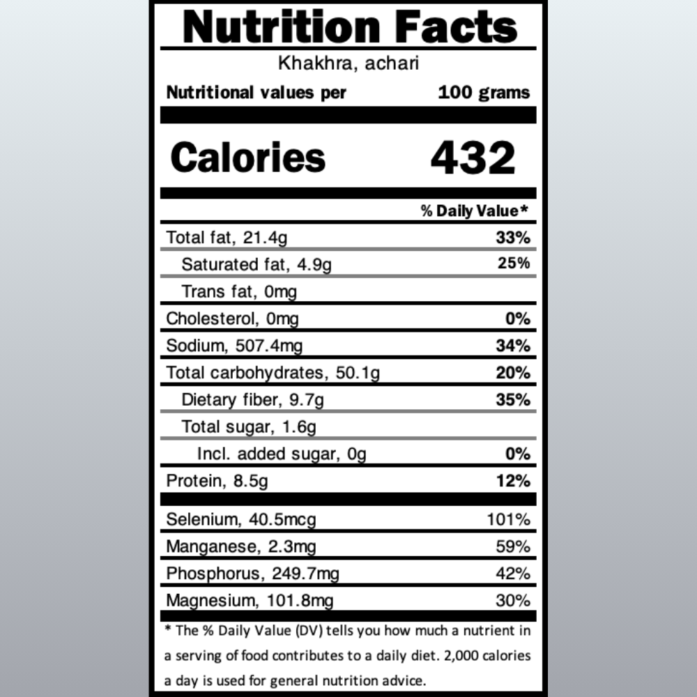 Crispy, golden-baked khakhra infused with the tangy zest of traditional achari spices. A wholesome, high-fibre snack that’s low on glycemic index and rich in contains naturally occurring antioxidants—perfect for guilt-free munching anytime, with a burst of spicy-savoury flavour in every bite.